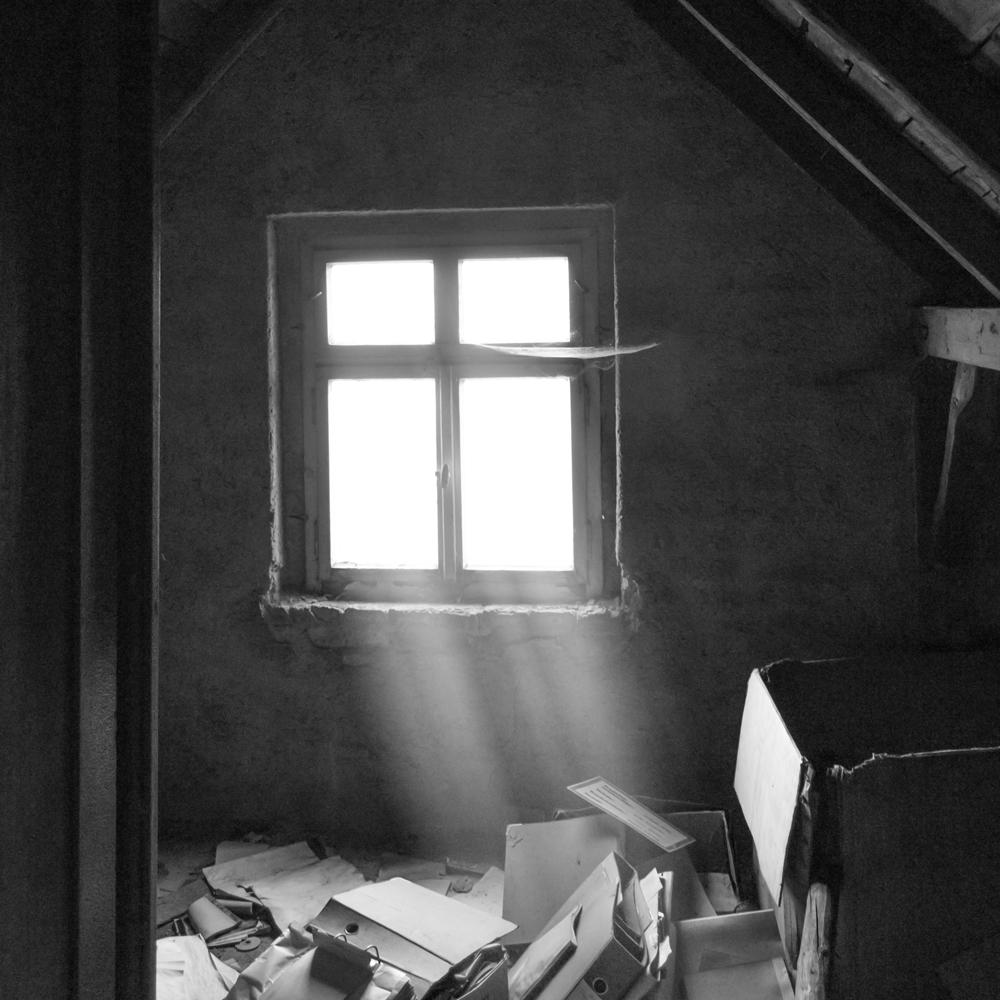 After the table had been set with cone hats, paper plates, plastic cups, goodie bags, and several salad bowls filled with M&Ms, she went into the kitchen. He listened to her light a cigarette and exhale, then snuck out of the closet and ascended the stairs, avoiding the creaky parts, two floors to the attic. Slowly, he opened the little door to the crawl space and slipped in, closing it behind him.