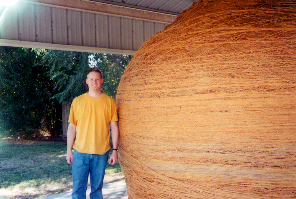 As I’m pulling away from Cawker City, however, it starts to bother me that I didn’t see the ball of twine. It is not likely that I will ever be in this part of the world again, and this is surely a momentous attraction, so finally about five miles outside of town I turn around and head back. Sure enough there it is, right across the street from the gift shop that distracted me earlier, so I get out and take some pictures and touch the rough twine and just like that I have a memory that will last a lifetime.