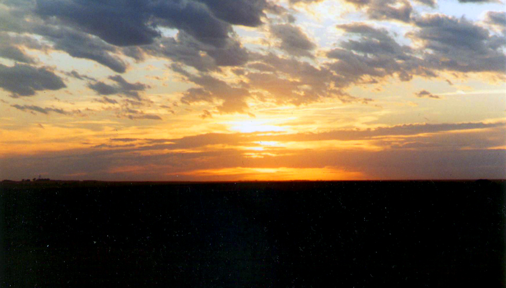 I am pleased to discover that the air conditioner is a much more modern-looking “ZoneAire” unit, which I decide that I’m not going to turn on until just before I go to bed so that if it does happen to be one of those on again/off again units, I will hopefully be asleep by the time it starts cycling. Satisfied with my accommodations, I set out to find dinner along the main drag of South Range Avenue and eventually turn onto a road that I think will lead to something a little more local than Taco Bell, KFC, or McDonald’s, but the road quickly turns into a dead end at the edge of a cornfield where the stalks have already been harvested. I am facing west and the bright orange haze of sun is descending towards the flat dark horizon and illuminating the edges of cobalt clouds stretched across the prairie sky. I know this is something I shouldn’t miss, so I park the truck and walk to the edge of the field and watch until the haze of light disappears behind the black.