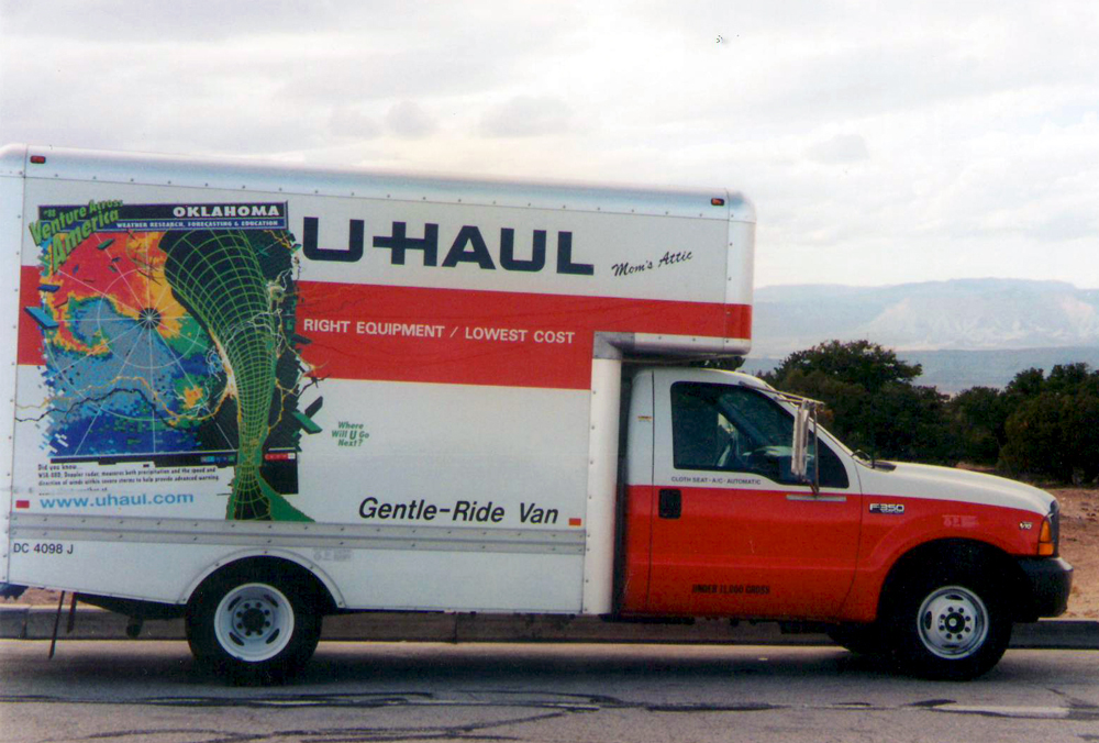 On one particular stretch where there is not another soul in sight, I decide to see what this U-Haul can do. I gradually press the gas pedal until it kisses the floor and watch the speedometer pass 80, 85, 90, 95… I really want to hit the century mark, but at 97 the truck starts shaking so violently that it feels like we’re passing through an atmospheric barrier. In my head I can hear Scotty yelling to Captain Kirk, “She’s givin’ all she’s got, Cap’n’!”, while on the bridge Kirk is keeping his cool staring straight ahead with both hands clutching the armrests of his captain’s chair. But I’m no Captain Kirk and this U-Haul truck is not the U.S.S. Enterprise, so I ease on the gas and will have to settle for 97, or “almost 100…”