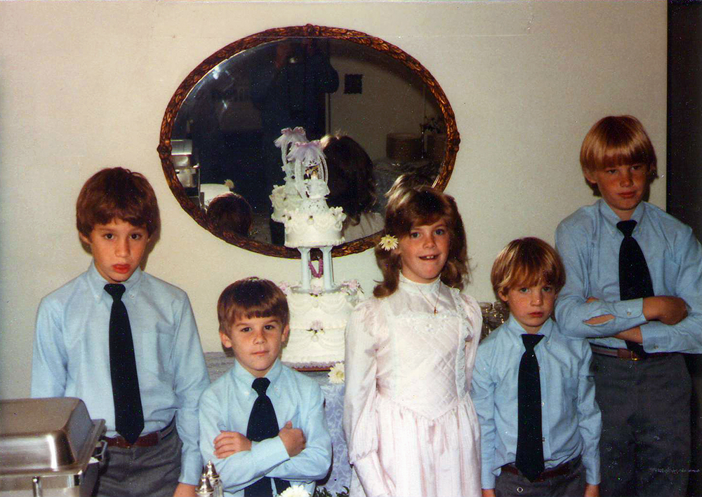 Carl, his brother, and Rick’s two sons were clad in matching light blue button-downs with navy-blue clip-on ties, gray trousers, and black oxfords from Sears, and his sister in a white and pink dress and black shoes, also from Sears.